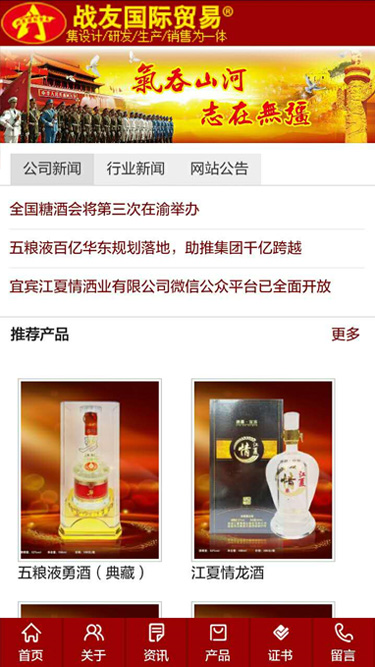 战友国际贸易是一家以军队文化为主体的公司,大部份产品向部队提供。公司主要从事酒类进出口贸易,其中大部份白酒、红酒、啤酒、洋酒、食品、茶叶、饮料等产品是集设计、研发、生产、销售为一体的多元化实体公司。